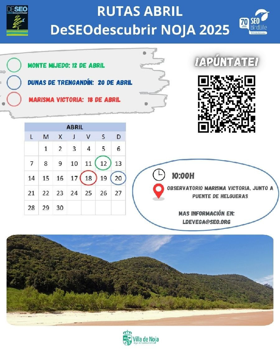 Las rutas comenzarán el 12 de abril con un recorrido por el Monte Mijedo, un encinar cantábrico con vistas panorámicas de Noja. El punto de encuentro será en el Observatorio Marisma Victoria, junto al puente de Helgueras, y la actividad se desarrollará de 10.00 a 13.00 horas.
