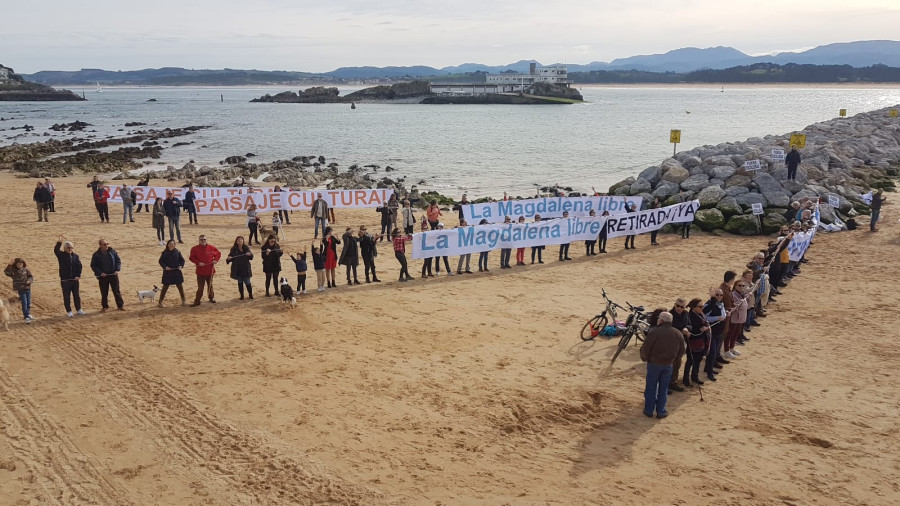 Unas 300 personas pasaron por la playa el domingo 9 de febrero convocadas por la plataforma salvar la Magdalena, para dar testimonio de que la escollera sigue en pie y exigir a los poderes públicos que cumplan sus compromisos y las retire. Los distintos oradores que desde las piedras tomaron la palabra, recordaron a los asistentes que aquello no era un acto político sino de reafirmación cívico social.