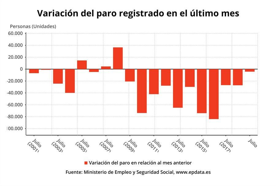 En España, el número de parados registrados en las oficinas de los servicios públicos de empleo (antiguo Inem) bajó en 4.253 desempleados en julio (-0,14%), su menor descenso en este mes desde 2002, cuando disminuyó en 1.111 personas. Tras el descenso de julio, el quinto consecutivo, el volumen total de parados se situó en 3.011.433 desempleados, la cifra más baja desde noviembre de 2008.