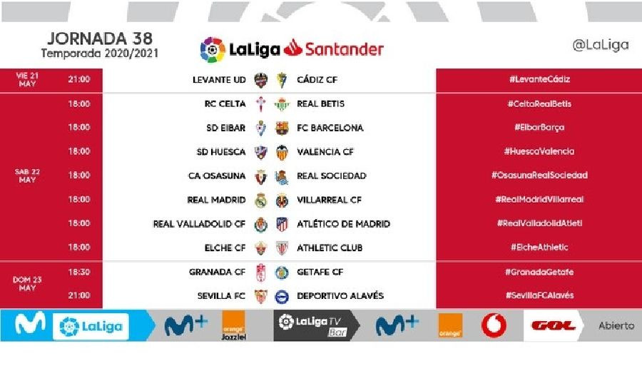 En total, siete partidos de esta jornada 38 (Celta-Real Betis, Eibar-FC Barcelona, Huesca-Valencia, Osasuna-Real Sociedad, Real Madrid-Villarreal, Real Valladolid-Atlético de Madrid y Elche-Athletic Club) se disputarán de forma unificada a las 18.00 horas del sábado 22 de mayo.