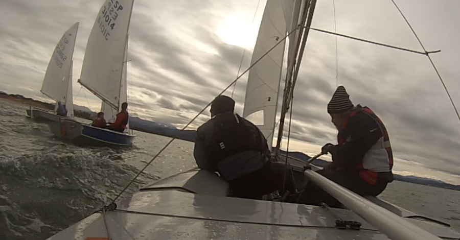 Afortunadamente, el parte no se cumplió, y a pesar de una lluvia persistente que caía sobre Santander, el viento, en la mañana del domingo, no superaba los 8 nudos, con lo que fueron 9 las tripulaciones que acudieron a tomar parte en esta tirada que abría la temporada 2023 para la vela ligera, Felizmente, la entrada del fuerte viento anunciado no sopló hasta después de terminadas las dos pruebas; alcanzando las rachas los 35 nudos a las 1605, en las cercanías de la pleamar.